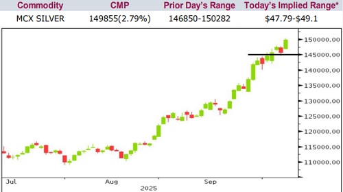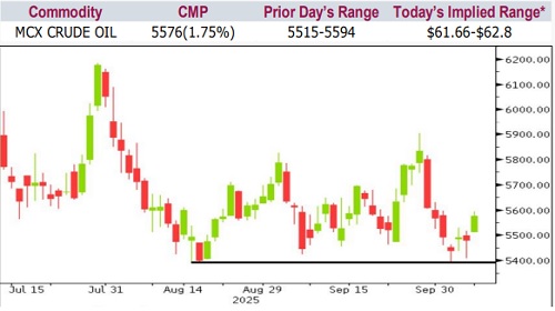 * Nymex Crude Oil settled marginally lower by around 0.5% in the last session. A modest output hike by OPEC+ helped limit the downside and stabilise prices at lower levels. Persistent supply concerns stemming from the Russia–Ukraine conflict also provided a cushion. However, higher inventory data and reports of a potential peace plan between Gaza and Israel triggered profit booking near the day’s high. Key support is seen around the $60 mark, and as long as this level holds, prices are likely to trade in a sideways range