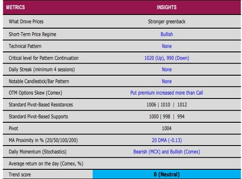 * Comex Copper declined by more than 1%, remaining under selling pressure for the third straight session. A stronger greenback and decreased probability of a rate cut next month dragged prices lower