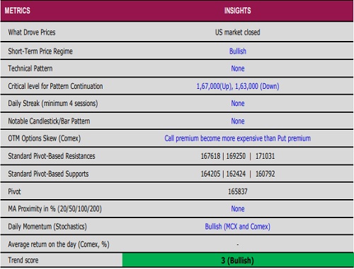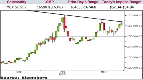 * Comex Gold extended its gains in the last session, closing above $4,160 and hovering near a two-week high. The near-term trend remains constructive as rising expectations of a Fed rate cut continue to support bullion. A breakout above the downward-sloping trendline adds to the bullish setup. As long as prices hold above $4,150, an advance toward $4,240 appears likely