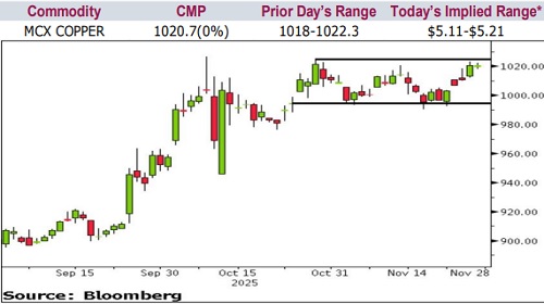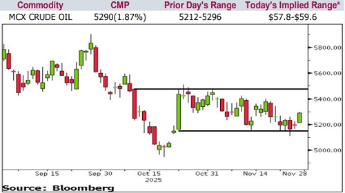 * Nymex Crude Oil edged higher nearly 1% higher, with broader risk sentiment improving on renewed rate-cut expectations. Hopes that OPEC+ may keep production unchanged at the upcoming meeting are also providing support on declines. On MCX, as long as the ?5,100 support zone remains intact, crude is expected to trade with a positive bias in the near term