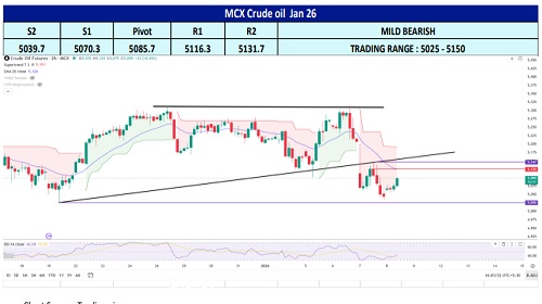 US natural gas futures rose over 1.5% to $3.60/MMBtu, extending gains for a second session as lower output and cooler mid-January weather forecasts improved nearterm demand expectations. A cold spell across the Midwest and East Coast (Jan 17–21) is likely to lift heating demand and support storage withdrawals. While Lower-48 production remains strong at 112.6 bcf/day, rising exports to Mexico offer incremental support. However, subdued domestic demand and softer LNG feedgas flows cap upside. It remains cautiously supportive in the near term, driven by weather-led consumption.