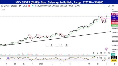 Bullion – Gold extended its historic rally, surging past the $4,900/ Oz, yesterday for the first time and settling at $4,936, a gain of over 2% supported by geopolitical uncertainty, a softer U.S. dollar, and firm expectations of Fed rate cuts later this year. Silver climbed over 3% to a fresh record near $96.6 as dollar eased after Trump withdrew tariff threats against European nations opposing his Greenland proposal. U.S. macro data showed mixed picture as jobless claims remained low, GDP growth was revised slightly higher, and consumer spending stayed resilient, while income growth softened. Core PCE inflation remained steady and in line with forecasts. Today, gold touched fresh highs of over $4,967 while silver at $99 as market pricing in two rate cuts in the 2 nd half of the year with geopolitical risk concerns, bullion retains a strong bias, though elevated levels may invite short-term consolidation ahead of upcoming PMI and consumer sentiment data.