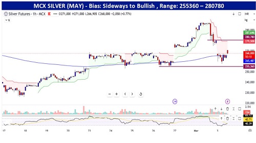Bullion – Spot gold and silver plunged over 4% and 8%, respectively, pressured by a firmer US dollar and surging global bond yields. A sharp equity sell-off further weighed on bullion, as investors liquidated long precious metal positions to meet margin calls. From recent highs, gold and silver have corrected over 7.5% and 19%, respectively, as the dollar index climbed to a 13-week high of 99.6. Elevated oil prices at over 8-month peak have lifted inflation expectations, dampening prospects for aggressive Fed easing. Markets now price in 37 bps of rate cuts this year, down from 60 bps last week, with only a 2% probability of a March cut. However, geopolitical tensions in West Asia supported a rebound today, with spot gold reclaiming $5,190 and silver rising above $85. Focus now shifts to US ADP Employment Change and Services PMI data.