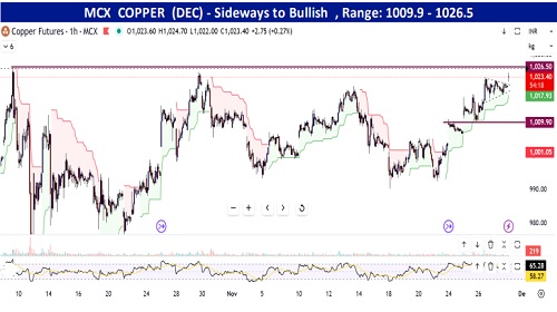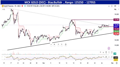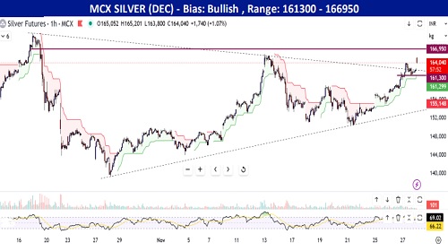 Bullion – Spot Gold settled moderately lower, settled below $4,160 per ounce on Thursday but held near a two-week high on expectation of potential Fed rate cut next month. Spot Silver was largely steady around $53.40 in a low-volume session, with US markets closed for the Thanksgiving holiday. A dovish Fed tone kept US Treasury yields under pressure slipping below 4%, while progress in Russia-Ukraine peace talks limited further upside in bullion. Overall, precious metals consolidated amid absence of major news flow. The reopening of the US government has allowed economic releases to resume, reaffirming a resilient labour market and easing inflation, strengthening expectations of a December Fed cut, now priced at an 87% probability. Today, gold trading above $4,190 on Fed rate cut expectations, escalating Japan-China tensions and broader geopolitical risks, heading for a fourth monthly gain and its strongest annual performance since 1979.
