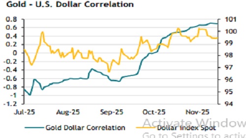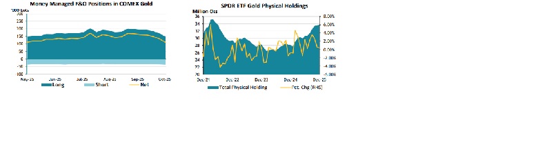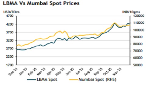 Gold spot prices in LBMA platform surged to a six-week high, approaching the record levels seen in October, driven by growing expectations of another Federal Reserve rate cut in December and ongoing geopolitical tensions. While optimism emerged from a tariff agreement between the U.S. and China, easing some traderelated concerns, economic data continues to paint a challenging picture. U.S. manufacturing contracted for the ninth consecutive month in November, as factories grappled with weak orders and rising input costs, partly due to lingering tariff effects. Similarly, China’s manufacturing PMI signalled contraction in November, underscoring sluggish demand and suggesting that progress in trade negotiations has yet to translate into a meaningful recovery. Although Fed Chair Powell recently tempered expectations for an immediate rate cut, citing shutdown-related disruptions and delayed data, markets now anticipate a December cut, supported by upcoming economic releases and dovish signals from several Fed officials. This policy outlook has further strengthened bullion’s appeal as a safe-haven asset. Additionally, central bank purchases and robust inflows into gold-backed exchange -traded funds (ETFs), signalled strong investor interest in bullion.
