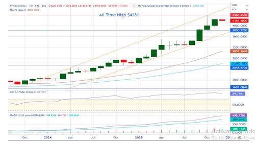 * Spot gold climbed to a six-week high of USD 4,210 per troy ounce, marking a gain of over 5% in the past month and moving closer to the record peak reached in October.