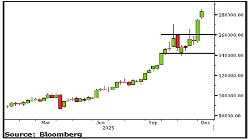 MCX Silver closed at a new record high, posting another weekly gain of 4.7%. The price structure continues to reflect higher highs, although the weekly RSI remains in the overbought zone, suggesting the possibility of temporary consolidation. A breakout above Rs 1,85,500 would likely extend the bullish momentum toward Rs 1,91,000 and Rs 1,95,000. On the downside, Rs 1,76,000 serves as a key support level. The broader trend remains positive with a continued pattern of higher highs.
