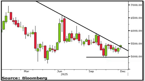 MCX Crude Oil gained nearly 2% for the week and continues to trade within a weekly symmetrical triangle pattern. The weekly RSI is holding firm above the 40 level, indicating underlying strength despite the consolidation. While the price may continue to edge higher, the upside remains capped unless the triangle resistance is taken out. A breakout above Rs 5,500 would provide room for a rally toward Rs 5,800 and Rs 6,000. Strong support is located at Rs 5,000.