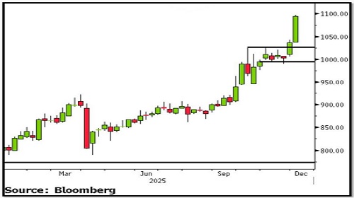 MCX Copper posted its strongest weekly gain of more than 5%, closing at a record level. The metal continues to show a robust bullish structure, supported by consistent higher highs and higher lows. The weekly RSI is firm and rising, reinforcing the positive outlook. A decisive move above Rs 1,097 could drive the price toward Rs 1,125 and Rs 1,140 in the coming sessions, while strong support is seen at Rs 1,050.