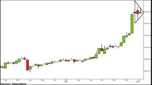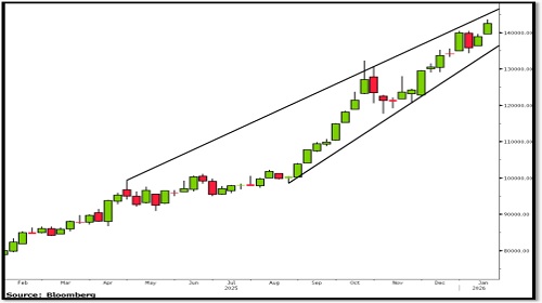 MCX Gold continues to trade in a well-defined uptrend on the weekly chart, characterised by a series of higher highs and higher lows. Prices closed the week with a strong bullish candle, reinforcing a positive near-term outlook. A sustained breakout above the Rs 1,43,600 level could open the door for further upside toward the Rs 1,47,000 and Rs 1,49,000 zones in the coming weeks. On the downside, Rs 1,36,000 remains a critical support. A decisive break below this level could trigger fresh selling pressure, potentially leading to a deeper correction toward the Rs 1,32,000– 1,30,000 region.