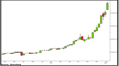 MCX Silver posted a sharp weekly gain of nearly 14%, forming a large bullish candle and maintaining a positive price structure. The broader trend remains bullish, and a breakout above Rs 2,93,000 could extend the rally toward the Rs 3,05,000 and Rs 3,13,000 levels in the near term. However, the weekly RSI is hovering around 92, indicating overbought conditions and the possibility of short-term consolidation. Strong support is placed near Rs 2,60,000; however, a breakdown below this level may invite renewed selling pressure.