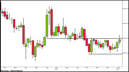 • WTI crude oil futures edged up 0.4% to settle at $59.4 per barrel, ending the week with gains of over 1%. Prices remained volatile as markets balanced lingering geopolitical risks against easing fears of an immediate US strike on Iran. Oil had earlier touched multi-month highs amid concerns that unrest in Iran could disrupt its roughly 3.3 Mn barrels per day output. Prices pared earlier losses after reports suggested a delay in US intervention, even as Washington continues to increase its military presence in the region.