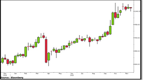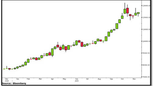 • Gold prices held steady on Friday after falling more than 1% earlier in the session, as traders increased bets on a December U.S. rate cut following dovish comments from Federal Reserve officials. New York Fed President John Williams said the central bank could still lower rates soon without jeopardising its inflation mandate. Rate-cut expectations rose to 70%, up from 46% earlier in the day. The delayed U.S. jobs report painted a mixed picture, with nonfarm payrolls rising by 119,000 in October—well above estimates of 50,000—while the unemployment rate climbed to a four-year high.