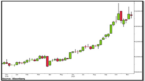 MCX Silver experienced a highly volatile week, finishing with a loss of nearly 1.2%. On the monthly chart, the trend remains firmly bullish and continues to indicate opportunities to buy on dips. A breakout above Rs 1,60,000 may open the door for a move toward Rs 1,66,000 and Rs 1,70,000 in the coming sessions. Major support is placed at Rs 1,48,000; a breakdown below this level could trigger fresh short positions. The weekly RSI is hovering around 75, suggesting overbought conditions.