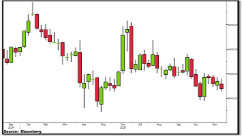 • Copper futures fell below $4.95 per pound, touching a two-week low amid signs of softer demand in China and expectations that the Fed will keep rates unchanged in December. China continues to face headwinds from its prolonged property slump and slower power-grid spending. Reports indicate Beijing may introduce new measures to support the weak real estate sector. China’s copper cathode imports fell 22.1% YoY in October and were down 15.7% from September. The metal also came under pressure from Fed signals pointing to a cautious policy stance amid economic uncertaint