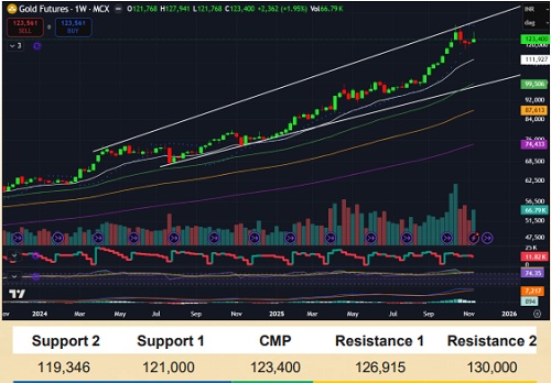 MCX Gold December contract has surged marginally towards 127,941 and paused its downside momentum. However, coming towards weekend, we have witnessed a decline of -4.81%, nearly fall of -6000 points from week's peak level and price managed to settle at 123412 On Weekly chart, price has formed a Bullish Hammer candle. Gold price is still trading in Rising channel, trading over its all key moving averages ie. 50, 100 and 200-DEMA levels placed at 118380, 111686 and 102544 respectively, Daily SAR is placed at 119,346. Breakout over week's high will add boost to upward momentum in Gold price and next hurdle would be at 130,685.
