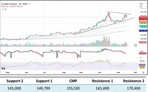 MCX Silver surged sharply during the week, posting gains of +16,000 points and marking a high of 165,810 before encountering a sharp mid-week decline of nearly -7% during Thursday and Friday sessions This corrective move has initiated the early formation of a potential double-top pattern, which calls for cautious positioning if prices fail to reclaim the upper range. The December contract, however, closed the week at 156,018, comfortably above the 20-50-100-200 DEMA levels placed at 151,590, 143,850, 133280 and 121550 respectively, reflecting sustained underlying strength. Open Interest (OI) declined by -7,000 lots over the week, indicating long unwinding and short-term profit booking rather than aggressive fresh shorts Daily indicators reveal continued positive momentum, the RSI stands at 58.04 after cooling from overbought territory, while MACD remains in positive crossover despite a reduction in histogram bars, signaling steady bullish undertones.