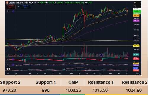 COMEX Silver extended its gains after a strong weekly rally, rising +12% and registering a three-week high at $5439/ounce. A mid-week round of profit-booking trimmed some of the upside, yet prices managed to close the week at $50.58, holding firmly above key moving averages The broader structure continues to remain constructive, with immediate support seen between $49.60-$45.55. Despite intraday volatility, the weekly momentum profile stays positive, indicating that buyers are likely to defend lower levels, and the trend is expected to remain firmon dips.