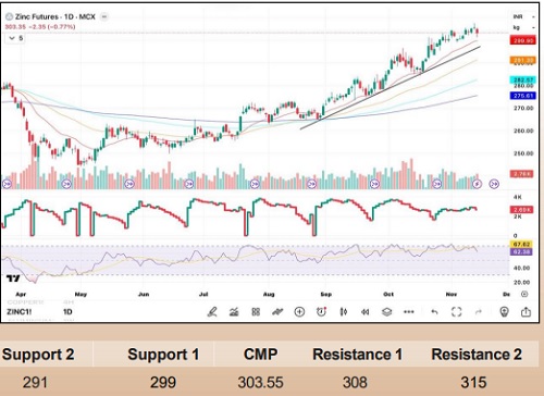 Zinc futures registered an upward move of +19% over the week, marking a high of 307.70 and closing the week at 30335, comfortably above key moving averages, including the 20-DEMA aligned near 299. Zinc maintaining stability despite intermittent pullbacks The ongoing respect of the rising trendline suggests that buyers remain active on declines, reinforcing the strategy of accumulating on dips as long as key support levels remain intact Immediate support is placed at 299-291 while resistance is identified at 308-315, where selling pressure or profit booking could emerge if prices approach the upper band of the range