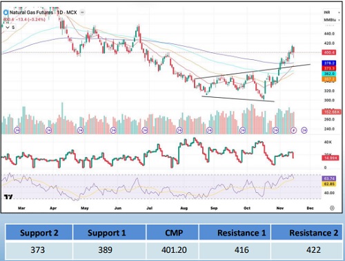 Open Interest (OI) declined by 9,000 lots on Friday, suggesting some profit-taking and reduction in speculative positions as prices approached key resistance, Technical indicators remain positive RSI has shifted above 60 (currently 63.74), but is nearing the overbought threshold, urging caution around the 416-422 resistance band Volumes have remained elevated, supporting bullish sentiment