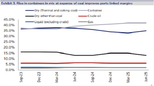 * But improving cargo mix and increases in marine/logistics EBITDA can lead to EBITDA beats: A straight math of a potential volume miss translating into an EBITDA miss is misunderstood concept for ADSEZ in our view. The volume weakness is largely offset by improved mix as container growth remained strong at 20% in 1HFY26 which potentially implies 44% container share in cargo mix in 2QFY26 vs 40% in 2QFY25 and 42% in 1QFY26. The share of other cargo (lower margin) especially thermal coal may dip further and may likely be flattish q-q at 70mnt. Further, we are witnessing sustained growth in logistics and marine revenues/EBITDA which are not captured in the volume data. All this considered we expect 2QFY26E EBITDA at INR56- 57bn leading to 1HFY26 EBITDA at INR112bn. This is well on track to exceed the guidance of INR210-220bn and FY26E EBITDA may end around INR230bn (inline with our estimates).