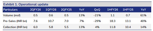 * Steady quarter: Rustomjee reported quarterly pre-sales of INR 7.6bn (+9% YoY; down 29% QoQ), slightly above our estimate of INR 7bn. For 1HFY26, bookings stands at INR 18.3bn (+40% YoY). Company achieved sales volume of 0.5msf (+9% YoY; down 21% QoQ) during the quarter. In 2QFY26, collections were at INR 6.0bn (+9% YoY; +5% QoQ) and 1HFY26 collections stood at INR 11.8bn (+13% YoY).