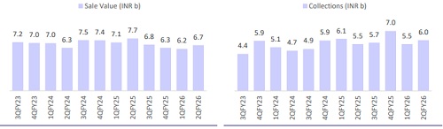 * Average sales realization stood at INR7,791/sqft, up 4% YoY and 6% QoQ. In 1HFY26, realizations were at INR7,565/sqft, up 2% YoY.