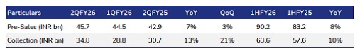 Lodha Developers Limited (Lodha) reported quarterly pre-sales of INR 45.7bn (+7% YoY, +3% QoQ), which was 9% beat on our estimates of INR 42bn. Collections came in at INR 34.8bn for 2QFY26, growing 13% on a YoY basis. Company expects launches to accelerate in 2H and has re-iterated the bookings guidance of INR 210bn. Net debt stood at INR 53.7bn during 2QFY26, up by INR 3bn sequentially due to record BD in 1H and continued spends on approvals of ongoing projects