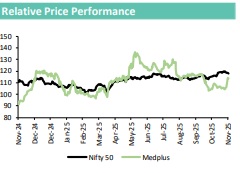 MEDPLUS reported a steady quarter with healthy topline growth and strong profitability despite a marginal revenue miss versus estimates. Consolidated revenue grew 6.5% YoY / 8.9% QoQ to Rs.16.8 bn, supported by new store additions and an increasing private-label mix. Gross margin expanded 240 bps YoY to 26.1%, aided by higher private-label contribution and efficient procurement. EBITDA rose 22% YoY to Rs. 1,488 mn, with margins improving 130 bps YoY to 9.9%, reflecting operating leverage and cost discipline. PAT grew 43% YoY to Rs. 555 mn, with margin expansion to 3.3%. Operating cash flow remained strong at Rs.1.26 bn, translating to 142% of EBITDA, while ROCE improved to 22.5%. The company added 117 net stores during the quarter, taking the total to 4,930 stores across 13 states and 1 UT. Mature stores (12+ months) continued to deliver robust profitability with 11.8% store-level EBITDA margin and 68.6% ROCE. Private-label portfolio expanded to over 1,450 SKUs, further supporting margin resilience. Overall, MEDPLUS continues to strengthen its position as a leading omni-channel pharmacy retailer through cluster-based expansion, higher-margin private-label growth, and efficient capital deployment.