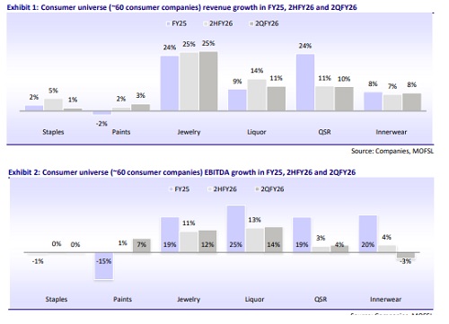 * Revenue/EBITDA/APAT performance of all our coverage sub-segments in 2QFY26: staples +1%/0%/0%, paint +7%/+17%/+13%, innerwear +4%/+0%/+0%, liquor +11%/+16%/+24%, QSR +10%/+4%/NA (loss widened in 2QFY26), and jewelry +26%/+25%/+26% YoY.