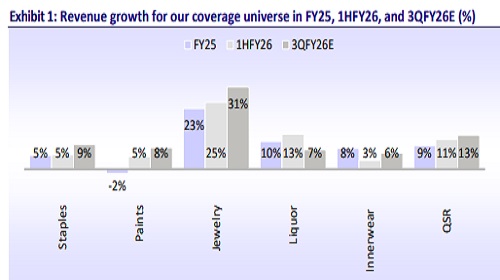 Within our consumer coverage universe, almost all segments are expected to see an improvement in revenue/EBITDA growth YoY in 3QFY26 — staples +9%/+7%, paints & adhesives +8%/+11%, liquor +7%/+12%, innerwear +6%/+2%, QSR +13%/+10%, and jewelry +31%/+20%.