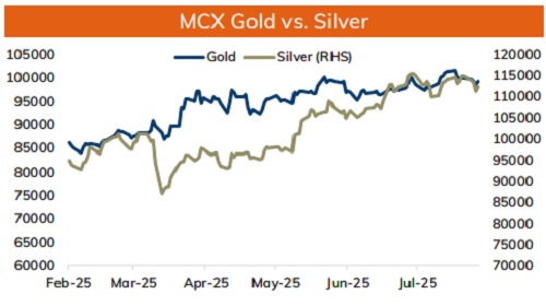 * Spot Gold is expected to slip towards $3300, a s long as it trades under $3375. MCX Gold October is expected to weaken towards Rs.98,500 as long as it remains below 20 DEMA at Rs.99,600 level.