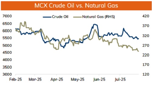 * On the data front, 60 put strike has higher OI concentration which would act as key support. On the upside 65 call strike, has higher OI concentration, which would likely to act as immediate hurdle. MCX Crude oil September is likely to consolidate in the band of Rs.5380 and Rs.5550 level. Only a move below Rs.5380 it would turn weaker.