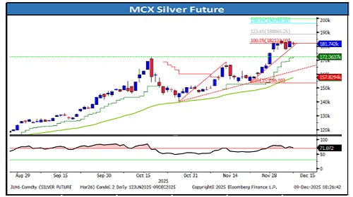 * Gold and silver declined on Monday as a stronger U.S. dollar and rising Treasury yields weighed on sentiment, with traders turning cautious ahead of the highly anticipated FOMC policy decision. Treasury yields moved higher as investors prepared for a series of government auctions and awaited Wednesday’s Federal Reserve announcement, which may influence policy expectations into 2026. Before the Fed’s decision, market participants will closely monitor the JOLTS job openings data due later today. For today’s session, bullion prices are expected to consolidate within a range.