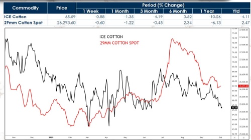 Price Performance: Cotton slipped recently under pressure from weak textile demand, higher imports, and global competition. Spot cotton 29mm also fell 1.35% in September to 29,270 amid sluggish trade. Overall, both markets reflect cautious sentiment with downside bias dominating near-term outlook.