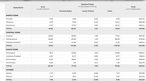 * Cotton output in 2024-25 is estimated at 312.40 lakh bales, down from 336.45 lakh bales in 2023-24, due to lower yields – CAI
