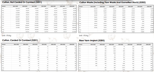 The CAI has increased its cotton imports for the 2024-25 season by 2 lakh bales to 41.00 lakh bales of 170 kgs. each (equivalent to 43.02 lakh running bales of 162 kgs. each) from 39.00 lakh bales of 170 kgs. each estimated previously. The cotton imports estimated by the CAI for the season are higher by 25.80 lakh bales of 170 kgs. each than 15.20 lakh bales of 170 kgs. each estimated for the last year. Upto 31st August 2025, about 36.75 lakh bales of 170 kgs. each (equivalent to 38.56 lakh running bales of 162 kgs. each) are estimated to have arrived the Indian Ports.