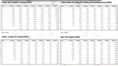 The CAI has maintained its cotton consumption estimate for 2024-25 season at 314.00 lakh bales of 170 kgs. each (equivalent to 329.51 lakh running bales of 162 kgs. each) i.e. at the same level as estimated previously. Upto 31st August 2025, the consumption is estimated at 286.00 lakh bales of 170 kgs. each (equivalent to 300.12 lakh running bales of 162 kgs. each).