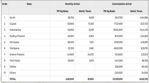 The closing stock at the end of 2024-25 season on 30th September 2025 is estimated at 60.59 lakh bales of 170 kgs. each (equivalent to 63.58 lakh running bales of 162 kgs. each) as against 39.19 lakh bales of 170 kgs. each (equivalent to 41.13 lakh running bales of 162 kgs. each) in last year.