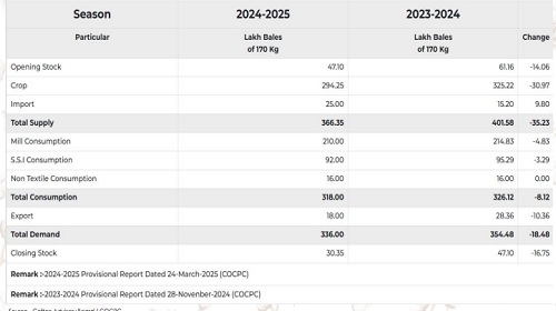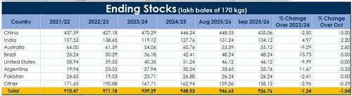 * Global cotton ending stocks for 2024/25 are at 948.53 lakh bales, but projected to dip slightly (-1.24%) to 936.76 lakh bales in 2025/26.