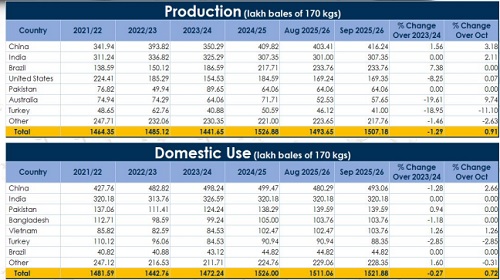 * USDA projected a 2% decline in India’s cotton production during the 2025-26 season.
