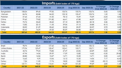 * Beginning stocks for 2025/26 are almost 1 million bales lower compared to last month.