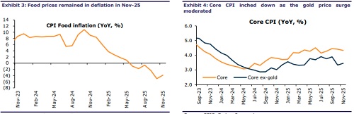 Core inflation dips as gold surge moderates Core inflation (ex-intoxicants) dipped to 4.3% (vs 4.4% prior), with monthly momentum dropping to 0.1% (vs 0.5% prior). A pause in gold-price surge was the major reason for such moderation; gold prices rose only 1% MoM in Nov (vs 12% prior), with silver prices rising 1.8% (vs 22% prior). As a result, the Personal Care category rose only 0.5% MoM (vs 5.7% prior). Other core inflation categories rose 0.1-0.2% MoM, while Education declined 0.1%. With gold prices remaining subdued, core CPI ex-gold rose to 3.4% (vs 3.3% prior), with monthly momentum rising to 0.4%.