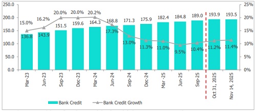 * As of November 14, 2025, total credit off-take rose to Rs 193.5 lakh crore, up 11.4% y-o-y. GST rate cuts, sustained retail and MSME activity, and some corporate borrowing amid rising bond yields all contributed to the increase. Meanwhile, this growth was slightly lower than the 11.6% growth in the same period last year due to reduced lending to certain segments.
