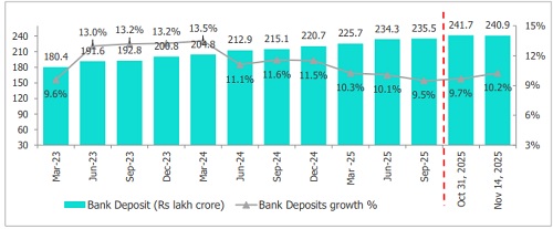 * As of November 14, 2025, aggregate bank deposits stood at Rs 240.9 lakh crore, reflecting a 10.2% y-o-y increase, though marginally declining by 0.3% over the previous fortnight. Deposit growth continued to lag the 11.5% (ex-merger) expansion recorded in the corresponding period last year, largely due to a shift of funds towards higher-yielding alternative investment avenues. The latest fortnightly movement was influenced by seasonal factors, with demand deposits rising 19.0% y-o-y, significantly higher than the 8.9% growth seen a year earlier, supported by a favourable base and stronger festive-season inflows. Meanwhile, time deposits, which constitute 87.6% of the total deposit base, grew by 9.1% y-o-y to Rs 211 lakh crore, moderating from 11.5% in the same period last year