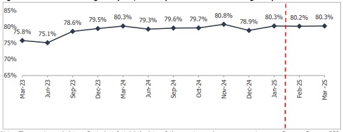 * Bank deposits rose 10.2% y-o-y to Rs 240.9 lakh crore, moderating from the 11.5% growth seen a year earlier (ex-merger). The moderation in growth is partly due to the ongoing rate-cut cycle, which has increased the attractiveness of alternative investments over conventional bank deposits.