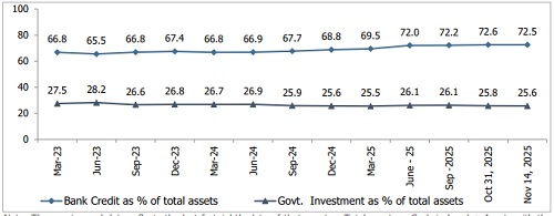 The bank credit-to-total-assets ratio and the government investment-to-total-assets ratio eased slightly by one and two bps to 72.5% and 25.6% in the fortnight ending November 14, 2025. Total government investments stood at Rs 68.3 lakh crore, reflecting a 5.3% y-o-y increase and a modest sequential decline of 0.8%. Meanwhile, balances with other banks and money at call and short notice rose sequentially, reflecting the banking system's surplus liquidity, which averaged around Rs 2.87 lakh crore during the fortnight.