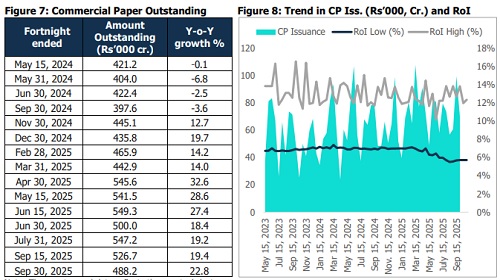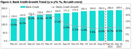 * Credit offtake rose 10.4% y-o-y in the fortnight ending September 19, 2025, marking a sequential uptick of 0.5% i.e. Rs 1.02 lakh crore over the previous fortnight, attributed to credit expansion to Micro and small enterprises. Meanwhile, this growth stayed well below the 13.4% (ex-merger) seen in the same period last year, weighed down by a high base effect, weaker corporate lending, deceleration in personal loans and reduced credit flow to NBFCs.