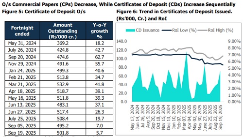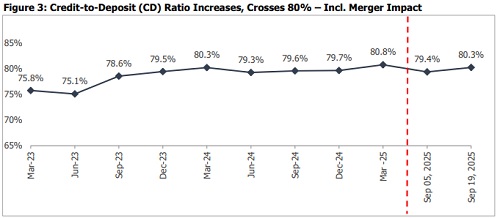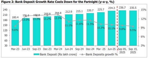* Deposits rose by 9.5% y-o-y, totalling Rs 235.5 lakh crore as of September 19, 2025, a decrease from 11.6% the previous year (excluding merger impact). The slower growth is attributed to a likely decline in bulk deposits, as banks offer relatively lower yields and shift towards alternative instruments, while justin-time government fund releases also dampen deposit growth.