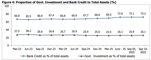 * The Bank credit-to-total-assets ratio and Government Investment-to-total-assets increased marginally by one and two basis points (bps), reaching 72.2% and 26.1% respectively for the current fortnight. Additionally, overall government investments totalled Rs 68.4 lakh crore as of September 19, 2025, reflecting a y-o-y growth of 6.9% and a sequential rise of 0.4%.